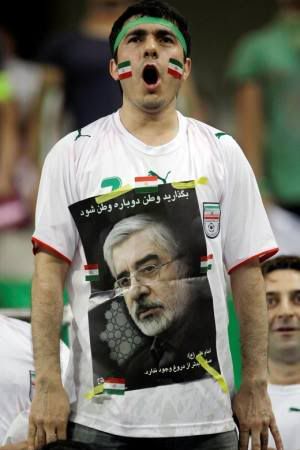 Nello stadio di Seul, la nazionale iraniana doveva battere la Corea del Sud per sperare ancora di passare il turno, ma in campo si giocava contemporaneamente un'altra partita. Alcuni giocatori iraniani si sono presentati con qualcosa di verde sulla casacca bianca d'ordinanza, protesta che si è aggiunta a quella sugli spalti, dove capeggiavo striscioni inneggianti a Mousavi e cartelli che chiedevano "Where is my vote?". Tra il primo e il secondo tempo qualcuno si è tolto la fascia e sul perché del ripensamento ci sono solo supposizioni.